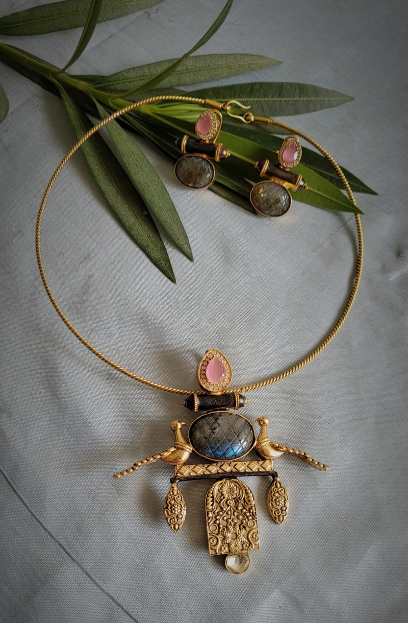 Coordinated Set: Includes a statement Hasli necklace and matching earrings, offering a complete and polished ethnic look.